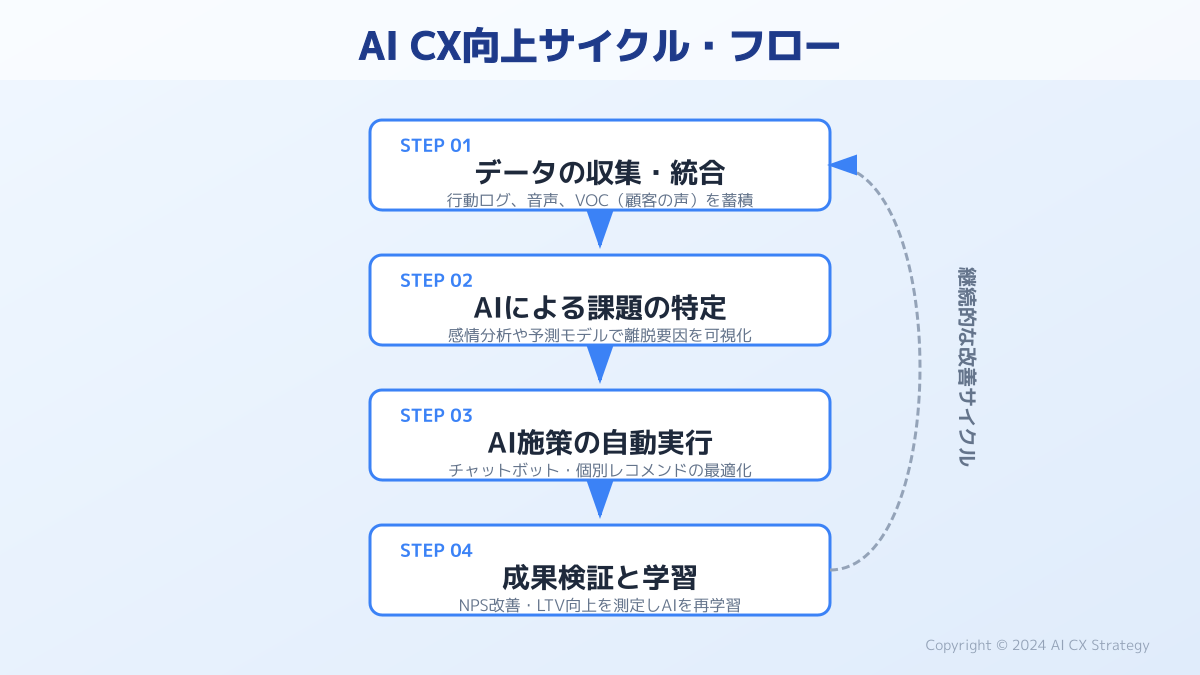 CX(顧客体験)を向上させる上で、AIによるデータ分析を活用したパーソナライズは非常に有効です。ユーザーの行動履歴をAIで分析し、最適なタイミングで必要な情報を提示することで、顧客の成功体験を強力に後押しできます。