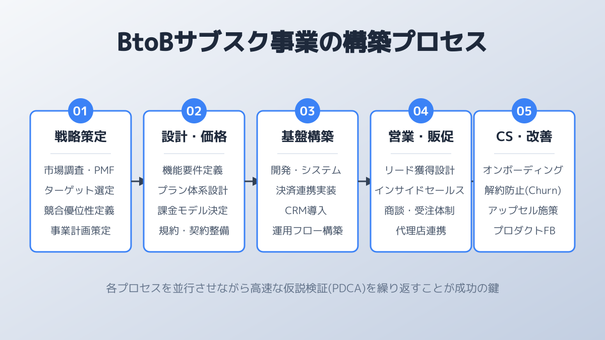 BtoBにおけるサブスク ビジネスモデルを成功に導くための4つ目のポイントは、行き当たりばったりではない事業構築プロセスの明確化です。