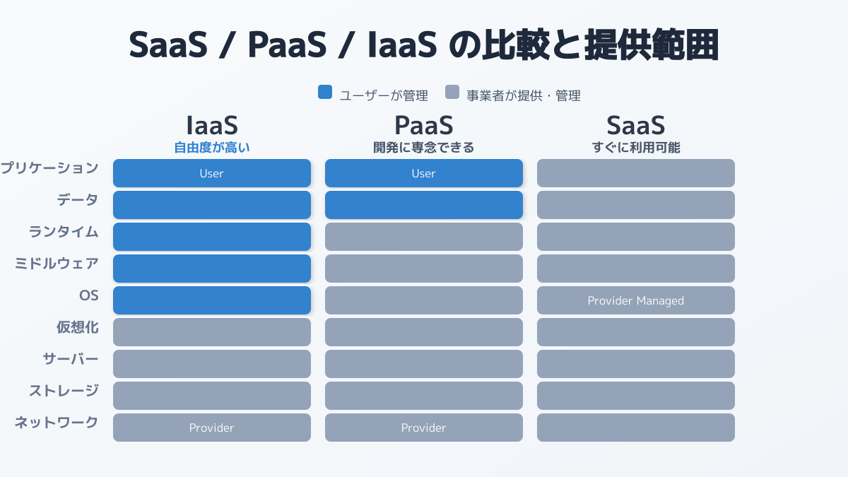 | サービスモデル | 提供範囲 | 利用者の管理責任範囲 | 具体的な代表サービス例 |