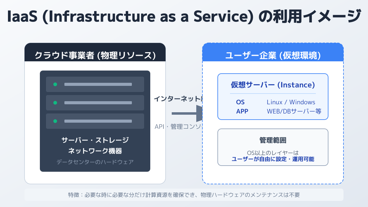| IaaS | インフラ(サーバー、ネットワーク、ストレージ) | アプリケーション、データ、ミドルウェア、OS | AWS EC2、Microsoft Azure VM、Google Compute Engine |