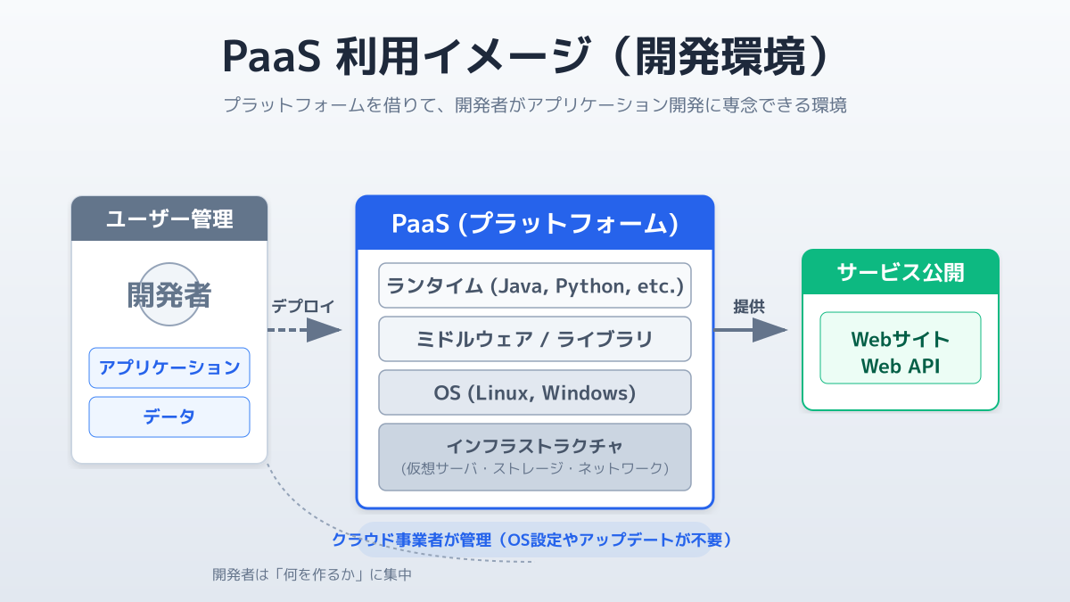 | PaaS | ミドルウェア、OS、インフラ | アプリケーション、データ | Heroku、Google App Engine、AWS Elastic Beanstalk |