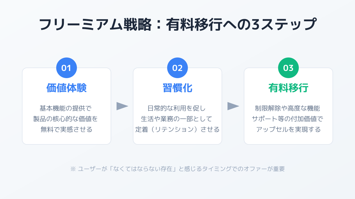 これらのステップを戦略的に実行することで、持続的な成長と収益化を実現できます。自社のプロダクトとユーザー特性に合わせて、最適なフリーミアムモデルを構築してください。