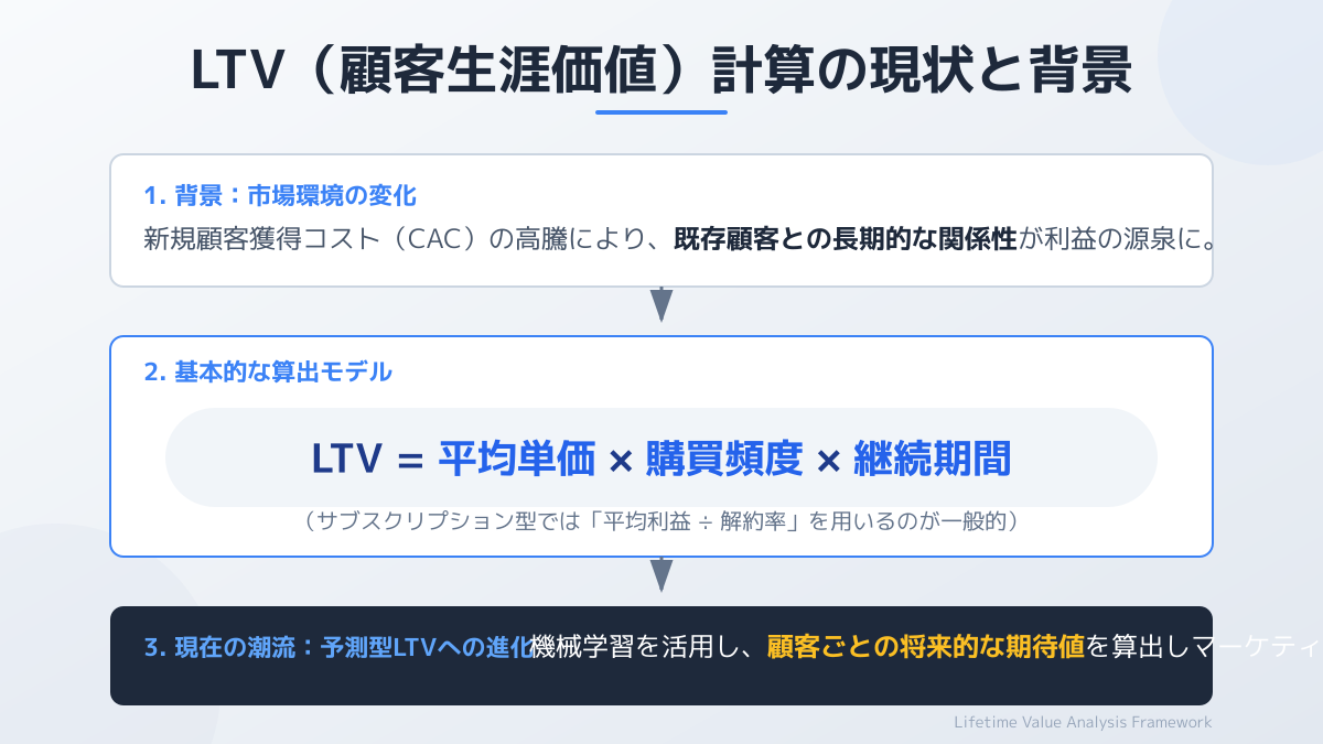 ここで求められるのが、自社のビジネスフェーズに適合したLTV計算方法を選択し、継続的にモニタリングする体制の構築です。市場環境の変化が激しい現在、正確なLTVの把握は、マーケティング投資の最適化やプロダクト開発の優先順位決定に直結します。
