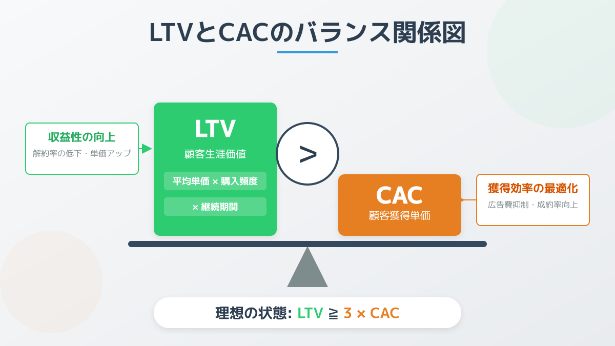 - LTVとCACのバランスを定期的に算出し、LTV/CAC比率3以上を維持することで事業の健全性を保つ