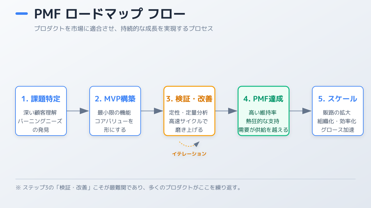 AI時代のSaaS新規事業において、2026年版のPMFを達成し、持続的な成長を遂げるためには、以下の5つのステップが不可欠です。