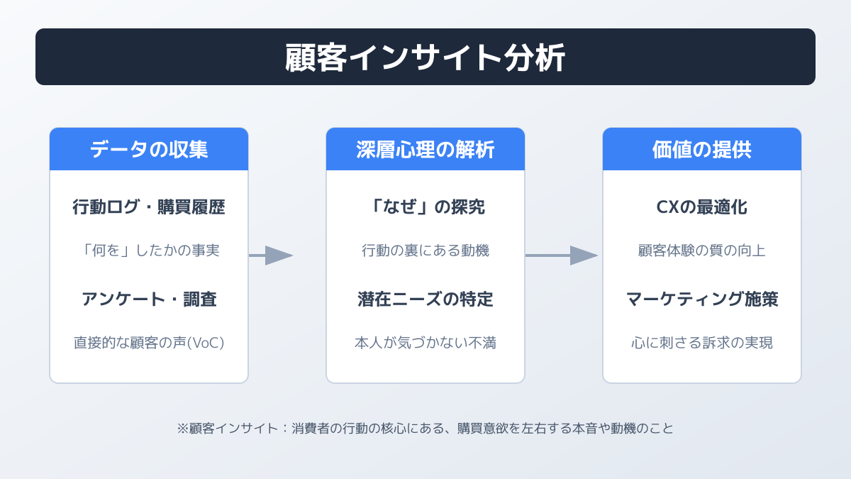 インサイト分析を現場で運用する際の最大の注意点は、定量データだけに依存しないことです。AIを活用したデータログ分析は強力ですが、それだけでは「なぜその行動をとったのか」という顧客の感情や背景までは読み取れません。必ず定期的なユーザーインタビューを実施し、一次情報に触れる機会を設けることが必須です。