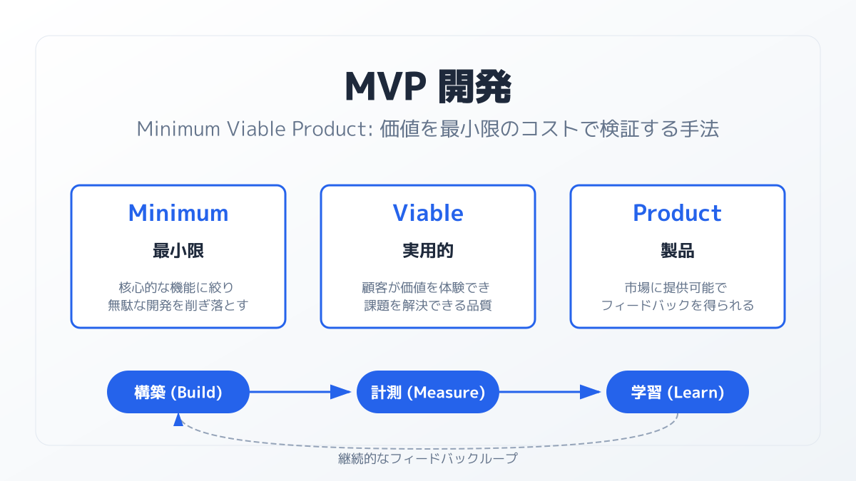 「MVPとはなんの略?ビジネスでどのような意味がある?」とお悩みの方へ。本記事では、MVP(実用最小限の製品)の意味や目的から、Dropboxなど有名企業の最小限(minimum)の開発事例を具体的に解説します。SaaS開発や新規事業を成功に導くリーンスタートアップの手法と、失敗を防ぐ判断基準も紹介します。