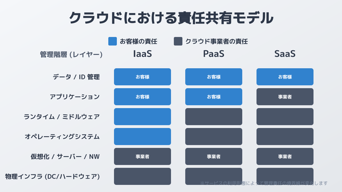 SaaSを安全に活用するためには、自社でサーバーを管理する従来のオンプレミスとは異なるセキュリティの考え方が求められます。その前提となるのが「責任共有モデル」です。