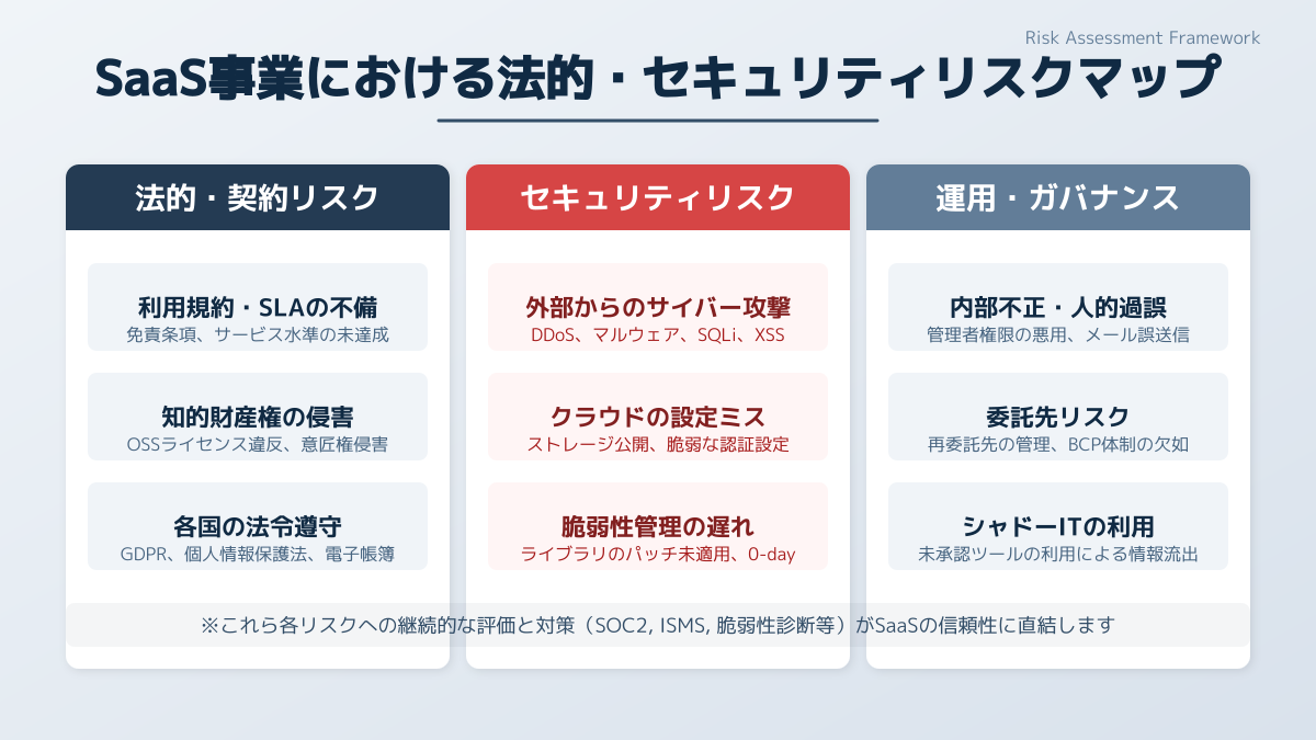 なお、オンプレミス環境と比較したSaaS特有のセキュリティ要件については、SaaS導入のセキュリティ対策とは?オンプレミスとの違いと7つの必須要件 で詳しく解説しています。また、自社のサービス名を騙るフィッシング詐欺などの外部要因によるインシデント対応については、サブスクリプション登録解除とは?迷惑メール詐欺から顧客を守る5つの対策 もあわせてご確認ください。