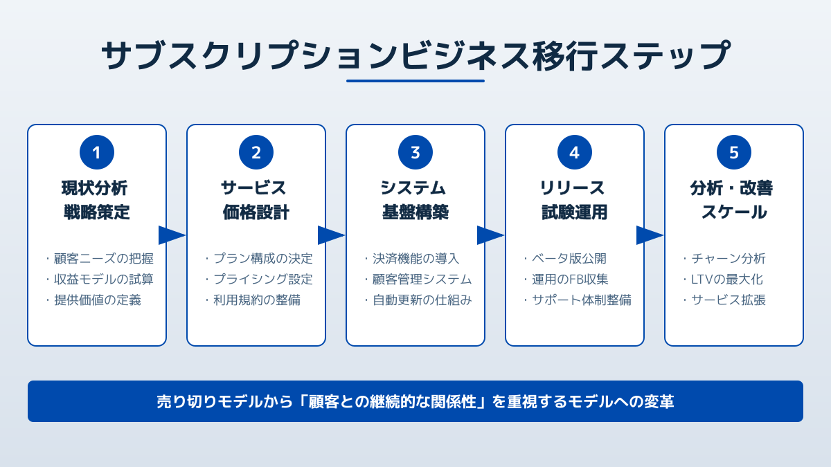 従来型の売り切りモデルからSaaSを核としたサブスク型ビジネスへの移行は、単なるシステム変更ではなく、事業全体の戦略的な転換を意味します。成功のためには、以下のポイントが不可欠です。