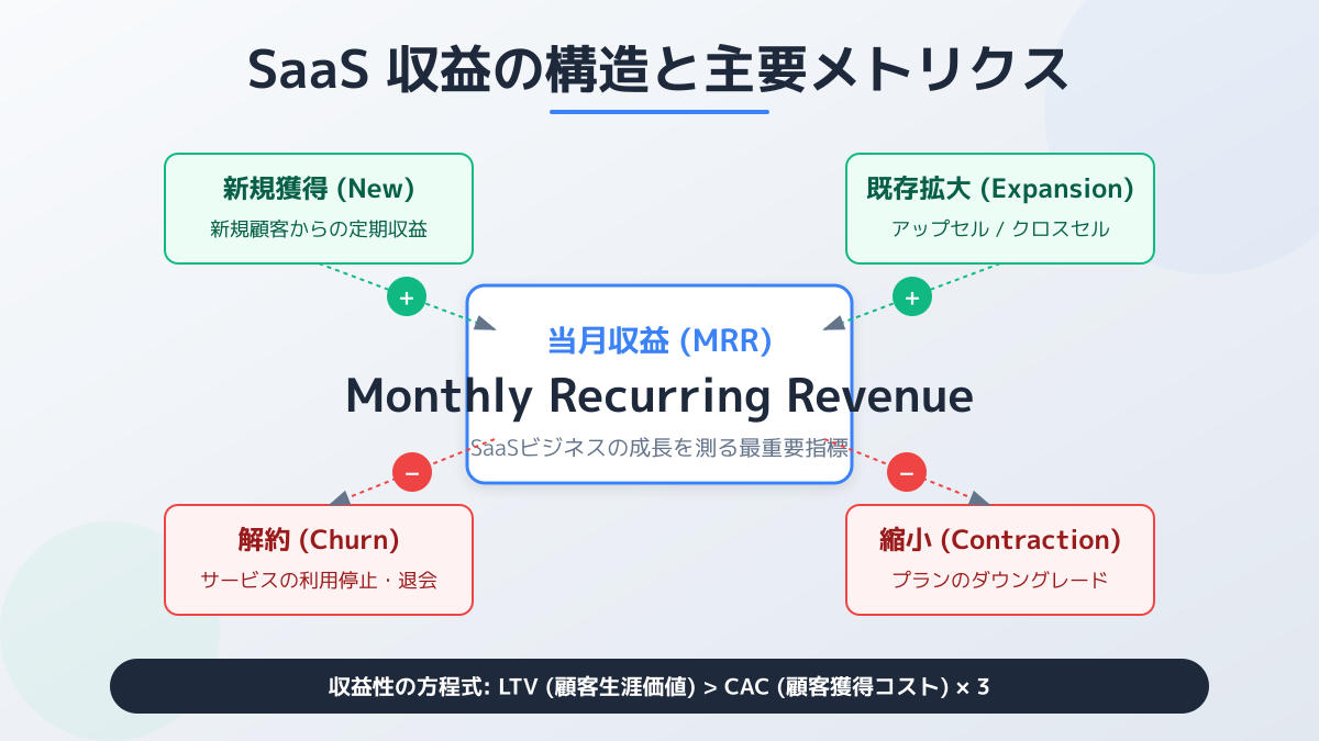 SaaSビジネスにおいて、MRRは事業の持続的な成長を測る上で最も重要なKPIです。市場の成長が鈍化傾向にある現在、新規顧客獲得に加えて、既存顧客からの収益拡大と解約率の抑制が成功の鍵を握ります。