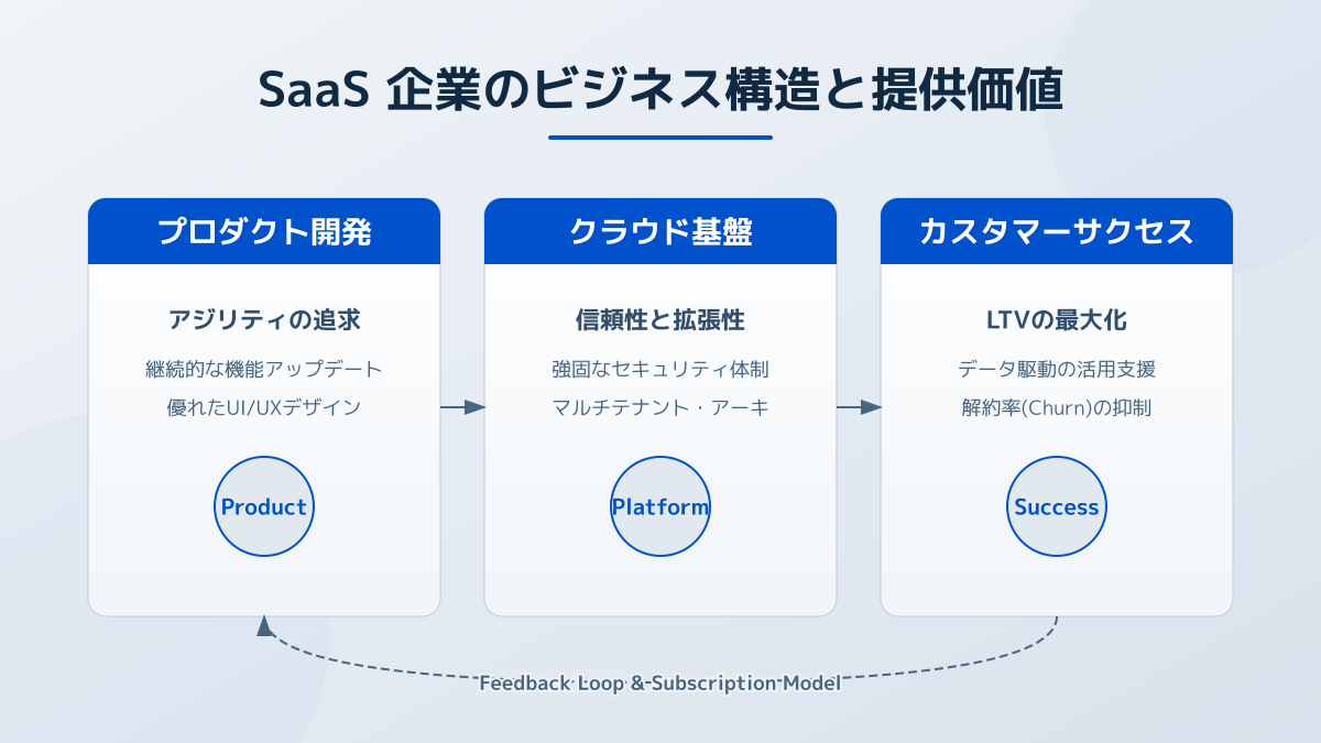 要点を整理すると、「製品単体での価値提供と自己完結型のユーザー体験の実現」に集約されます。顧客の行動データを製品開発に直接反映させるループを構築することが、SaaS事業を持続的な成長へ導く鍵となります。