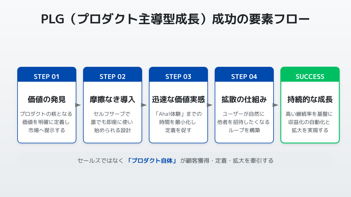- データドリブンな改善: ユーザー行動データを分析し、PQLを活用して継続的に事業を最適化する体制が不可欠です。