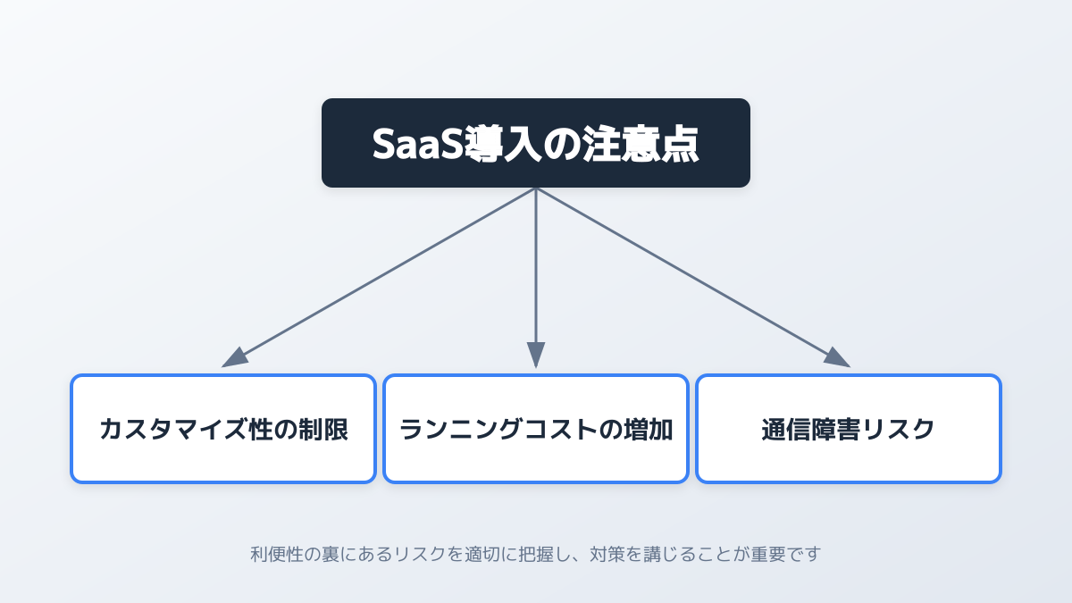 一方で、SaaSの導入にはいくつかのデメリットや注意点も存在します。最も留意すべきは、カスタマイズ性の制限です。提供される機能の範囲内で業務フローを合わせる必要があるため、独自の複雑なプロセスを持つ企業には不向きな場合があります。