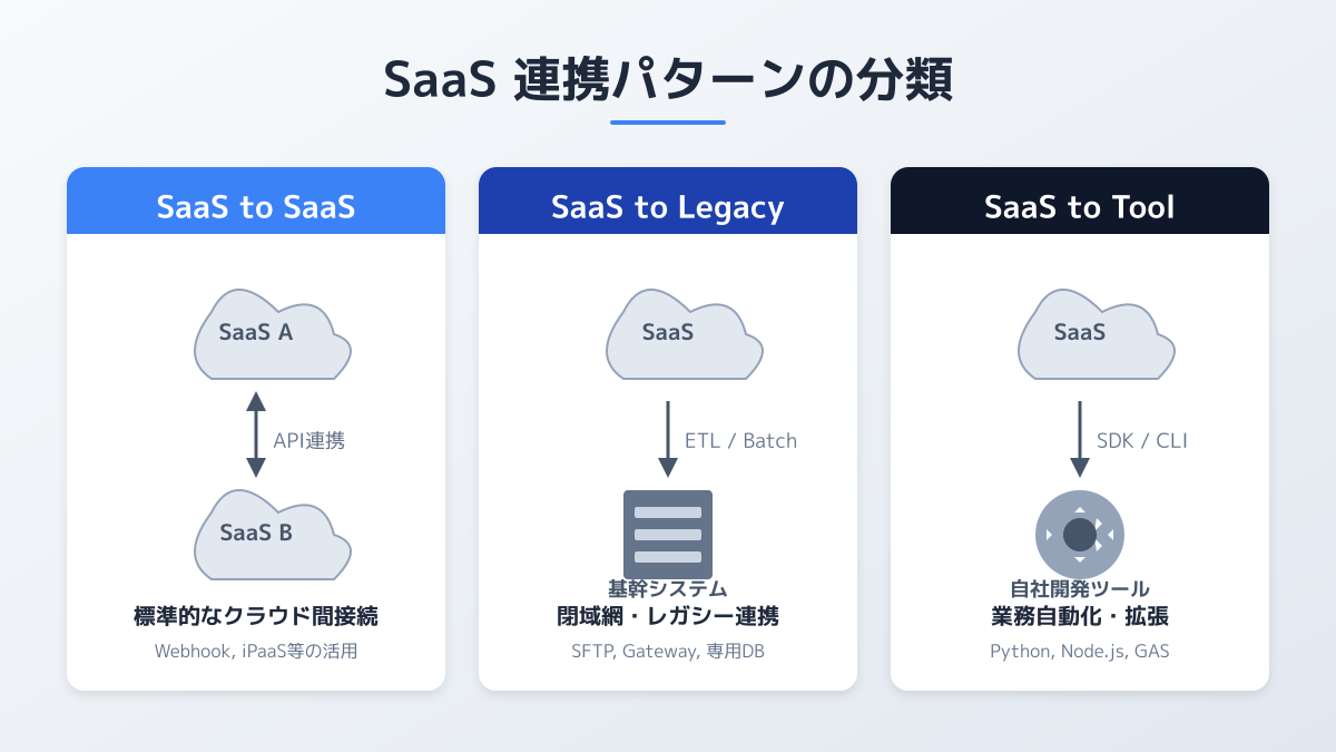 | SaaS (Software as a Service) | ソフトウェア機能すべて | なし(利用とデータ入力のみ) | Salesforce、Slack、Zoom、SmartHR |